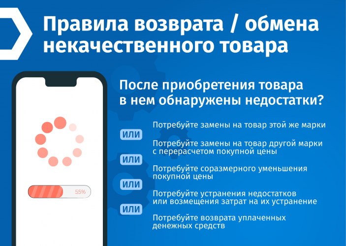 Права покупателя на обмен или возврат товаров регулируются Законом Российской Федерации от 07.02.1992 № 2300-1 «О защите прав потребителей».