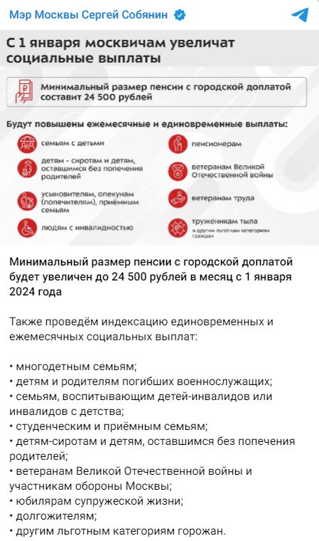 С 1 января 2024 года минимальный размер пенсии с городской доплатой будет увеличен до 24 500 рублей в месяц. Также будет проведена индексация социальных выплат москвичам. Об этом в своем телеграм-канале написал Сергей Собянин.