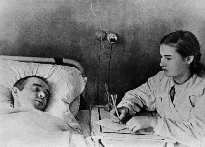 Пионерка Э. Челлини пишет письмо под диктовку раненого бойца И.П.Латуева.