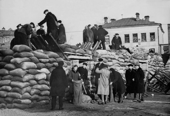 Строительство баррикад на одной из улиц Москвы в дни осадного положения.