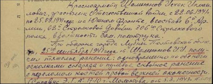 5-я армия, в составе которой была дивизия Шамьюнова, остановила наступление войск немецкой армии на линии железной дороги у города Коростень в 130 км от Киева. «Приказ – держаться», – расшифровывал радист, а за окном блиндажа рвались снаряды. Бои шли около месяца. Из окружения прорвались только 500 бойцов, включая Шамьюнова. В ходе ожесточенных боев Исхак Исмаилович был ранен осколками снаряда в обе ноги и получил сквозное пулевое ранение с переломом руки. «Многие солдаты после подобных ранений были комиссованы и отправлены в тыл восстанавливать народное хозяйство, но не дед. Он вернулся на фронт», – вспоминает Марат Шамьюнов.
