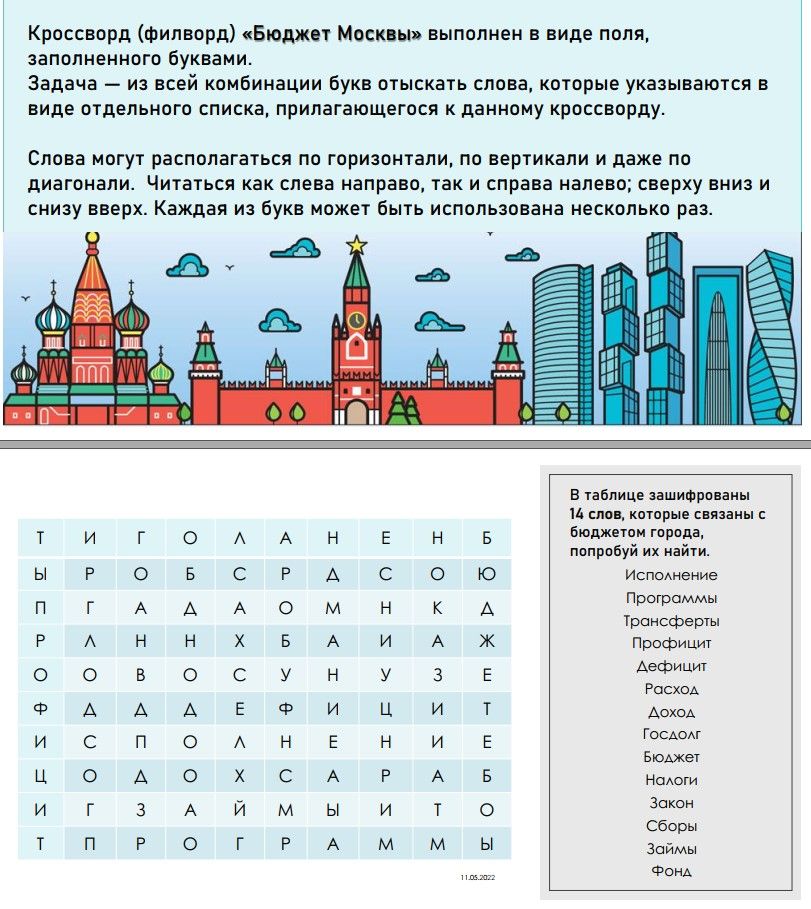 Ученица 4 класса московской школы № 1637 Татьяна Кирюшина составила кроссворд (филворд) «Бюджет Москвы».