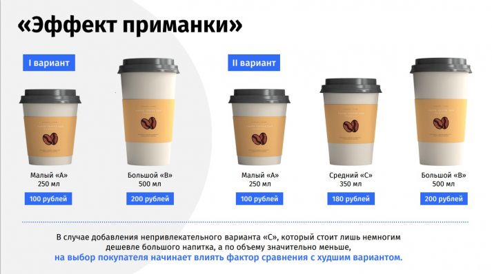 Во время мастер-класса Наталья Пивкина обратила особое внимание на самые популярные маркетинговые приемы. Одним из таких приемов является «эффект якоря». Его суть в том, что при первом знакомстве с товаром покупатели оценивают его стоимость, сравнивая с ценами на окружающие товары, чтобы выбрать самый выгодный вариант. Магазины используют этот эффект, выставляя на витрину товар со скидкой рядом с дорогими товарами. Таким образом стоимость акционного товара кажется более привлекательной. Другой популярный маркетинговый прием - «эффект приманки». Приманка заключается в том, чтобы подтолкнуть потребителя к определенной покупке. Потребители выбирают несколько критериев, например, цену и количество, чтобы определить для себя, выбор какого товара будет оптимальным. «Эффект приманки» концентрирует внимание покупателя в определенном направлении, создавая ощущение, что он делает рациональный выбор.