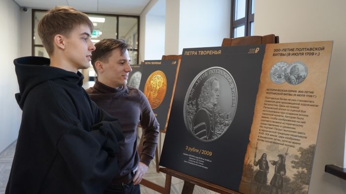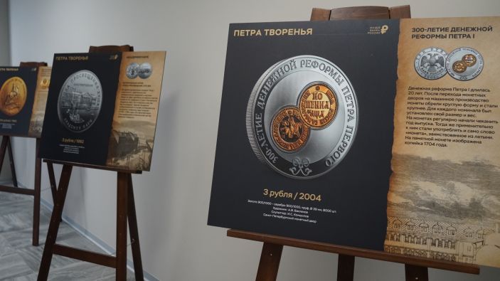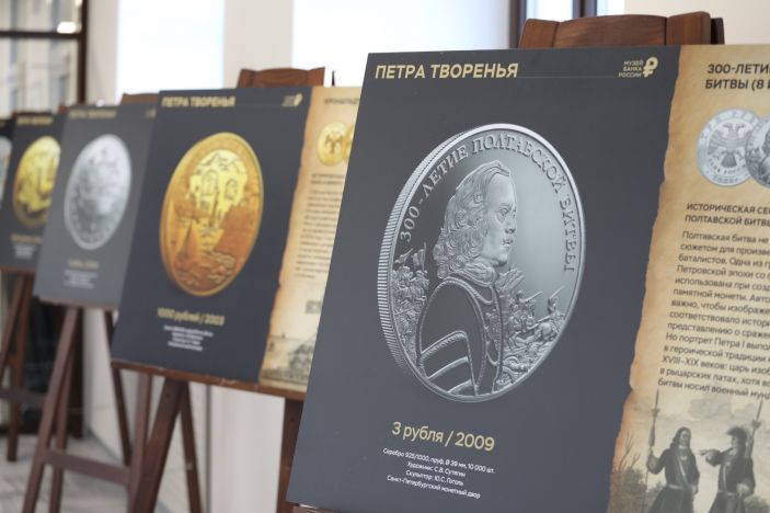 На фотополотнах выставки представлены изображения памятных монет Банка России, тематически связанных с Петровской эпохой.