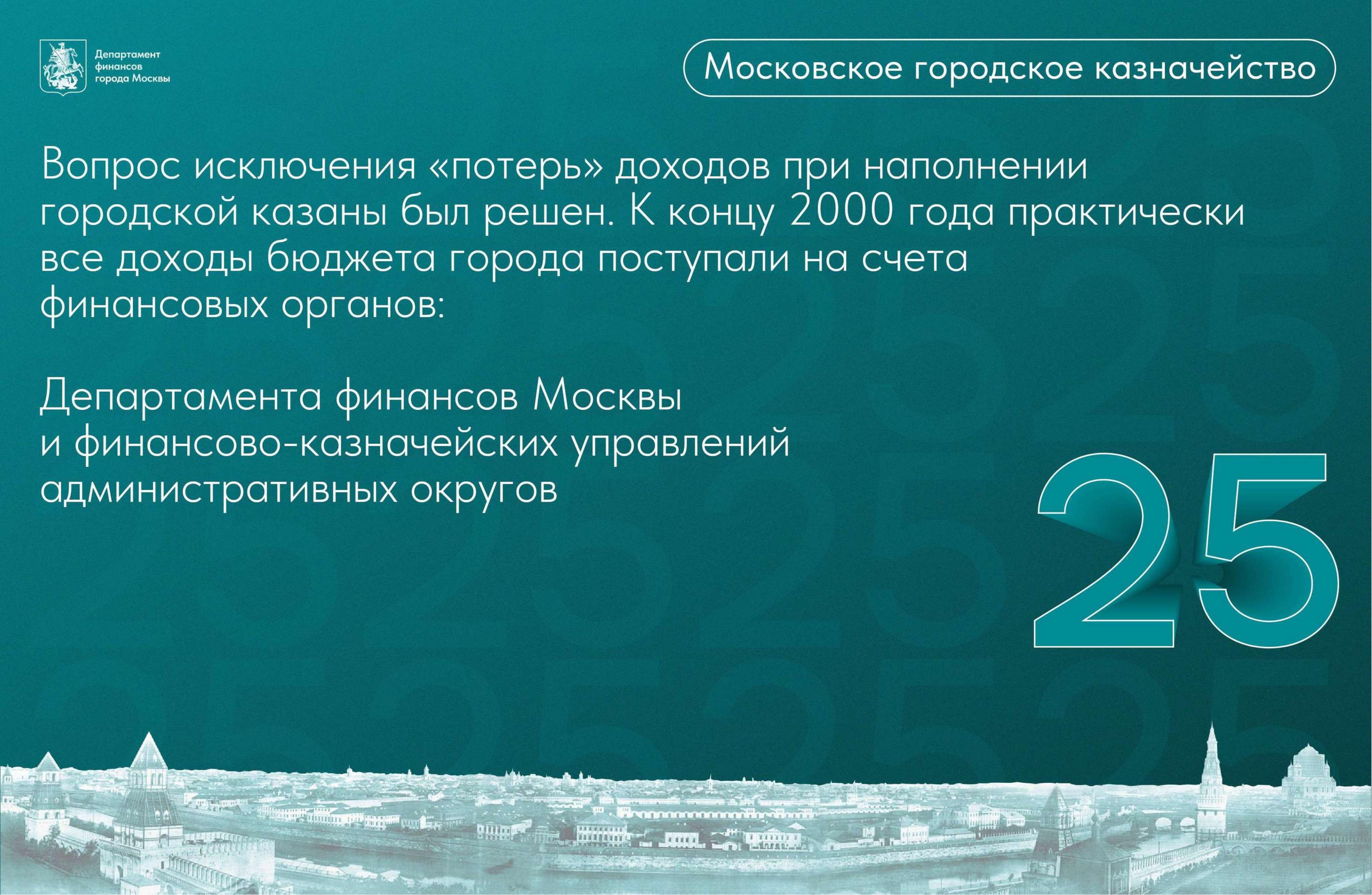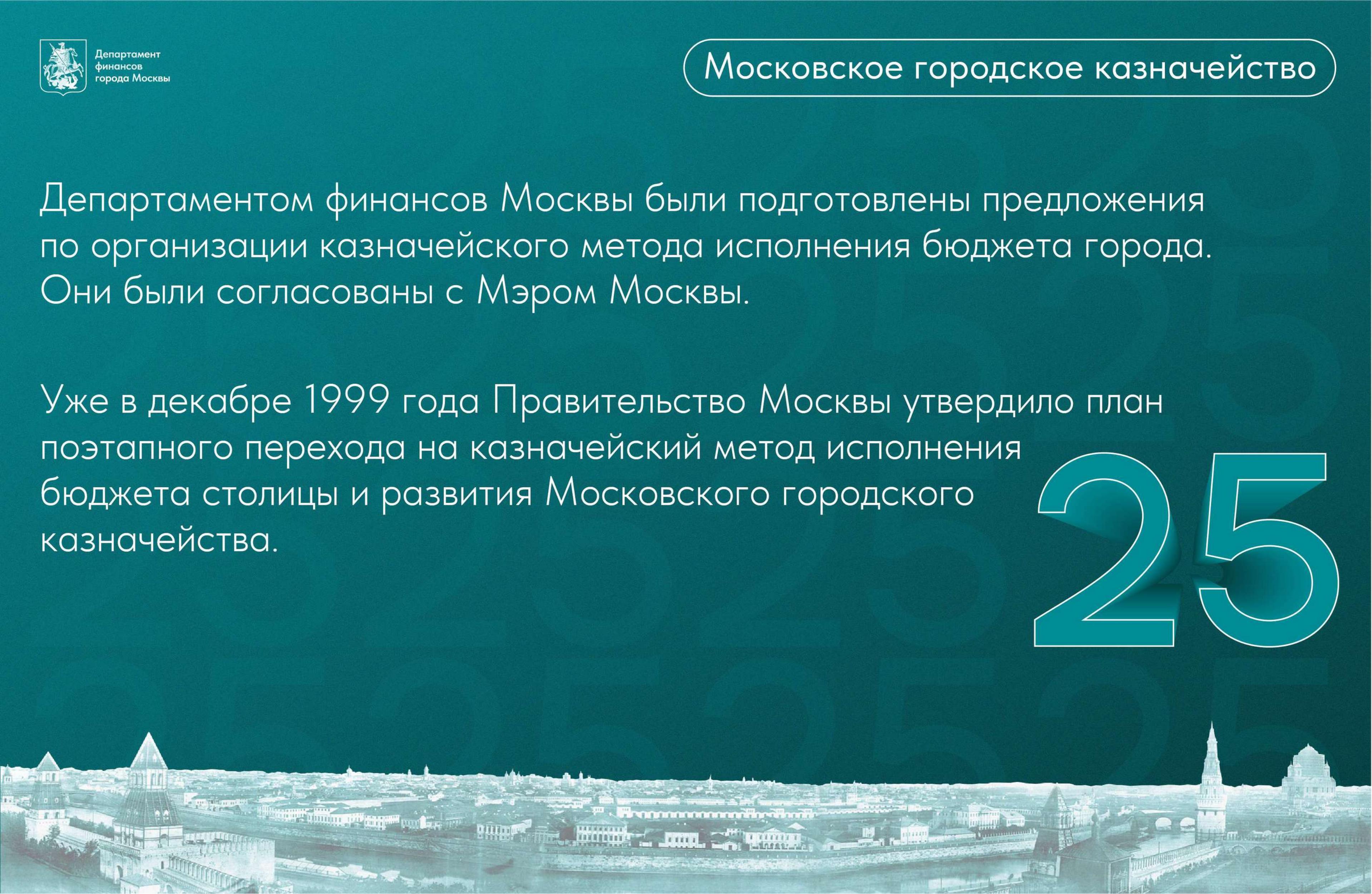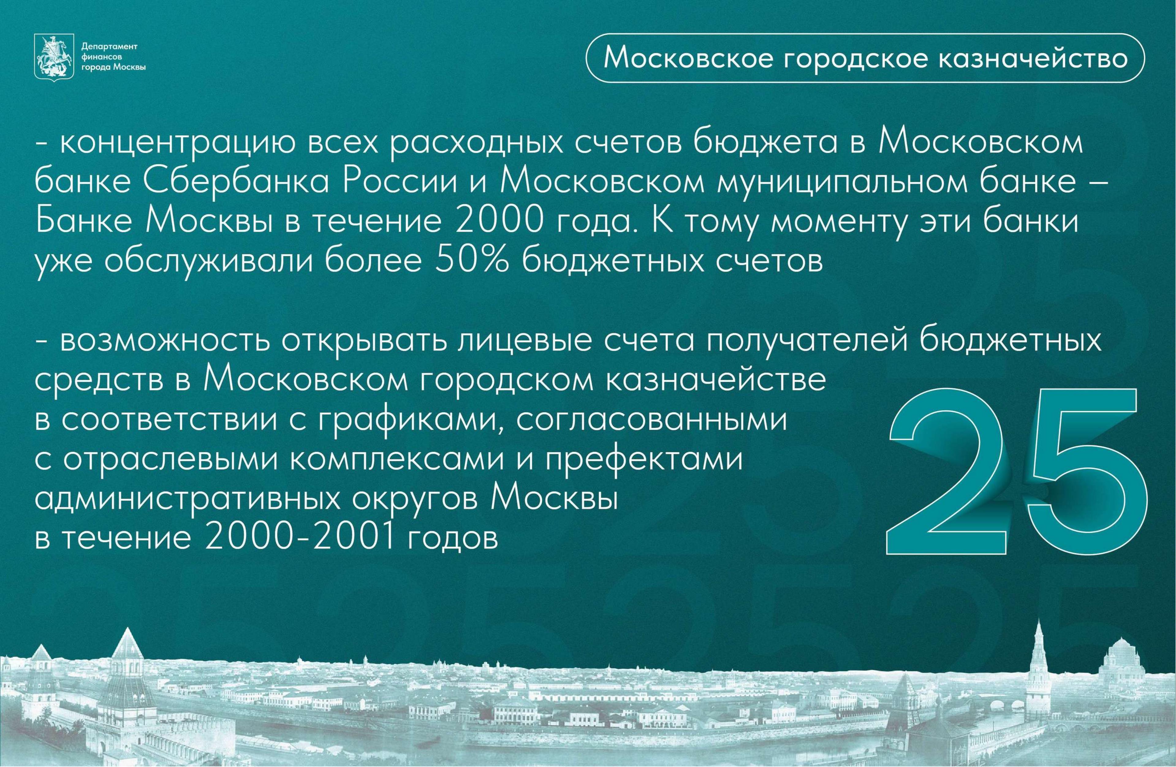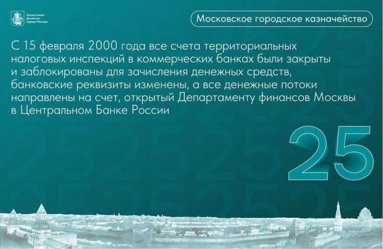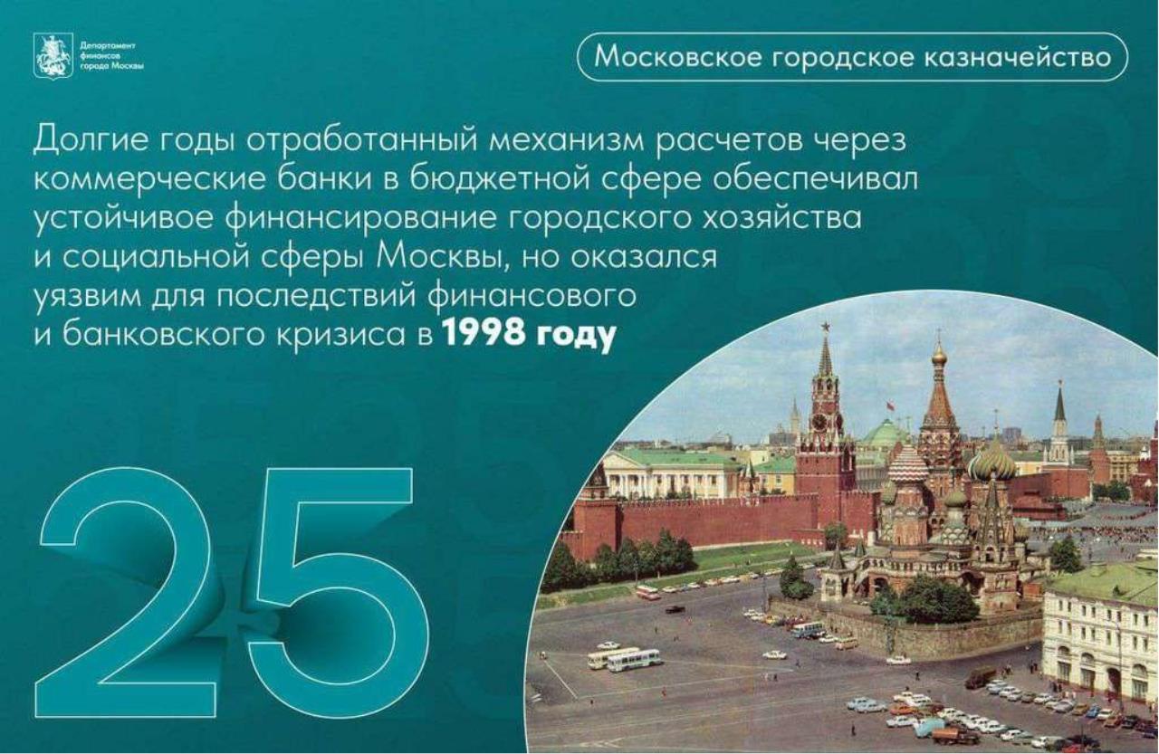 В прошлом году Московскому городскому казначейству исполнилось 25 лет. Мы решили вспомнить, с чего все начиналось и какие результаты за это время достигнуты. Благодаря нашим карточкам вы сможете окунуться в атмосферу начала XXI века и узнать интересные факты о развитии столичных финансов и казначейской системы.