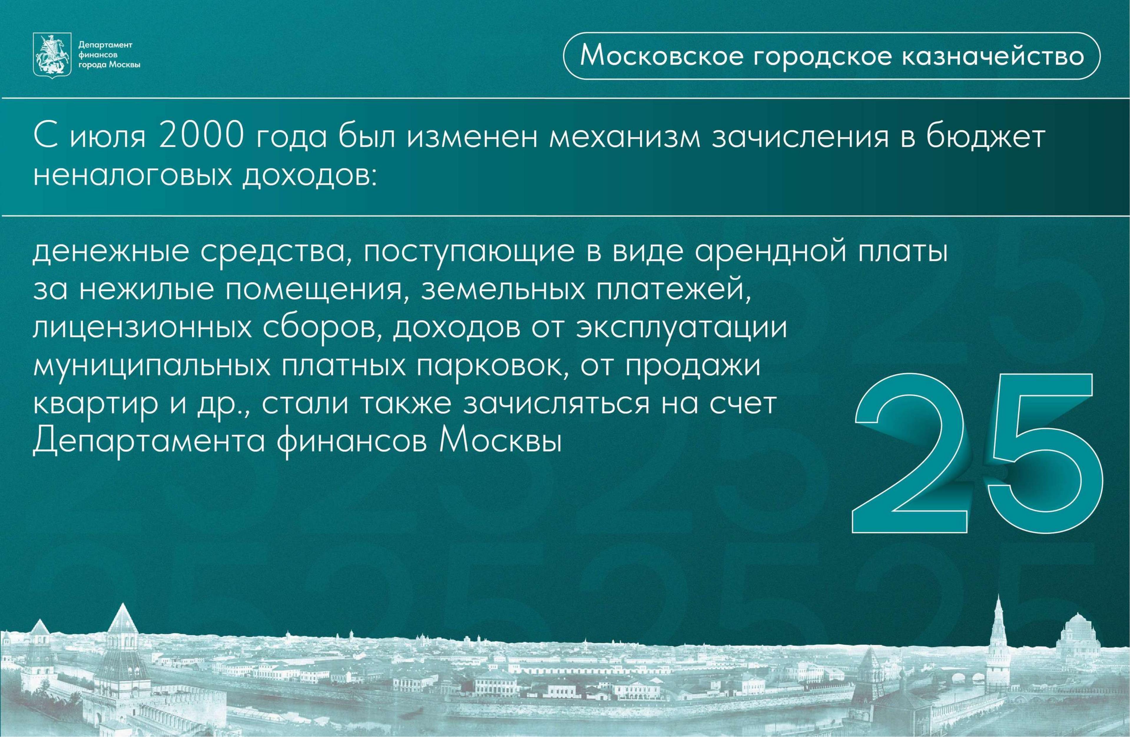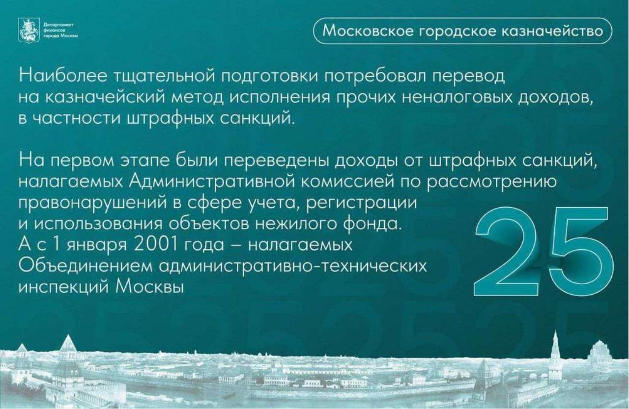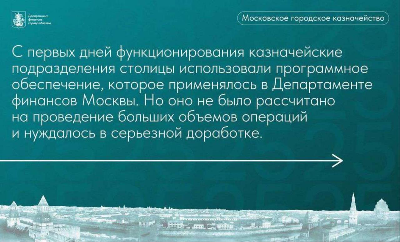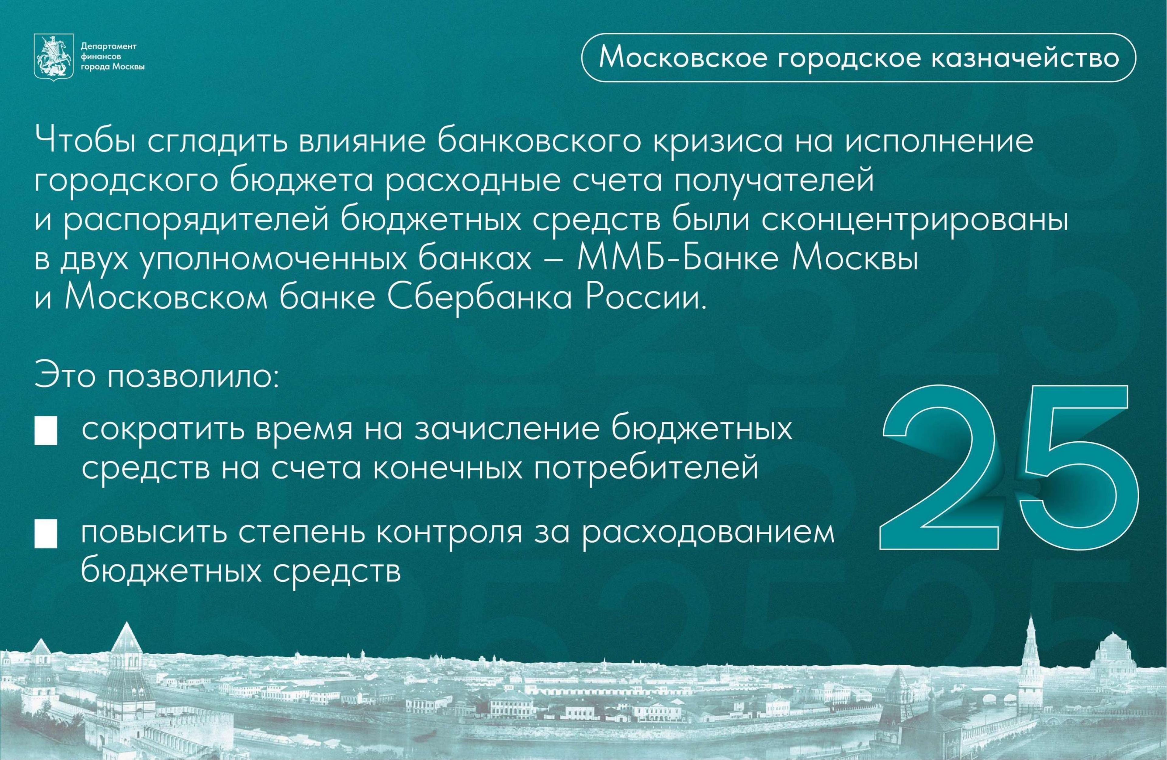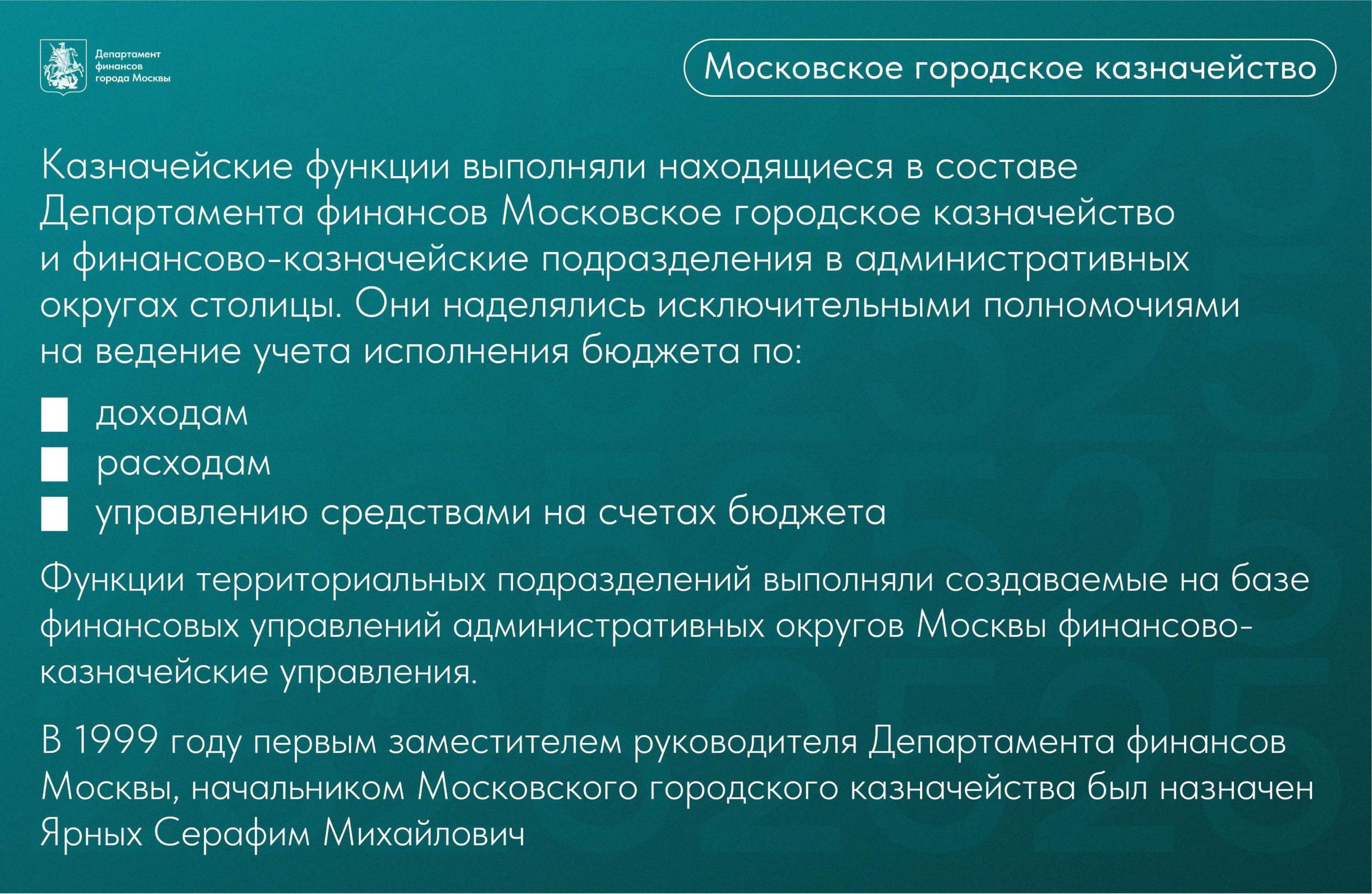 В прошлом году Московскому городскому казначейству исполнилось 25 лет. Мы решили вспомнить, с чего все начиналось и какие результаты за это время достигнуты. Благодаря нашим карточкам вы сможете окунуться в атмосферу начала XXI века и узнать интересные факты о развитии столичных финансов и казначейской системы.