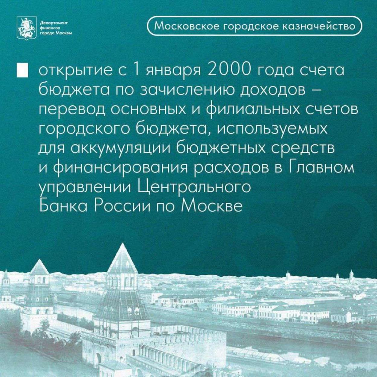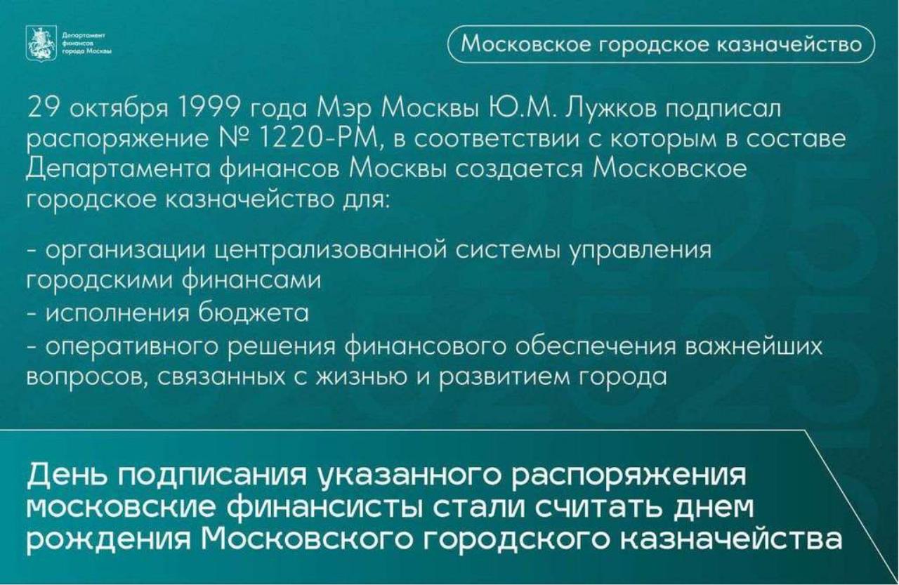 29 октября 1999 года Мэр Москвы подписал распоряжение об образовании Московского городского казначейства в составе Департамента финансов Москвы. Эта дата вошла в историю финансовой системы столицы как день рождения организации.